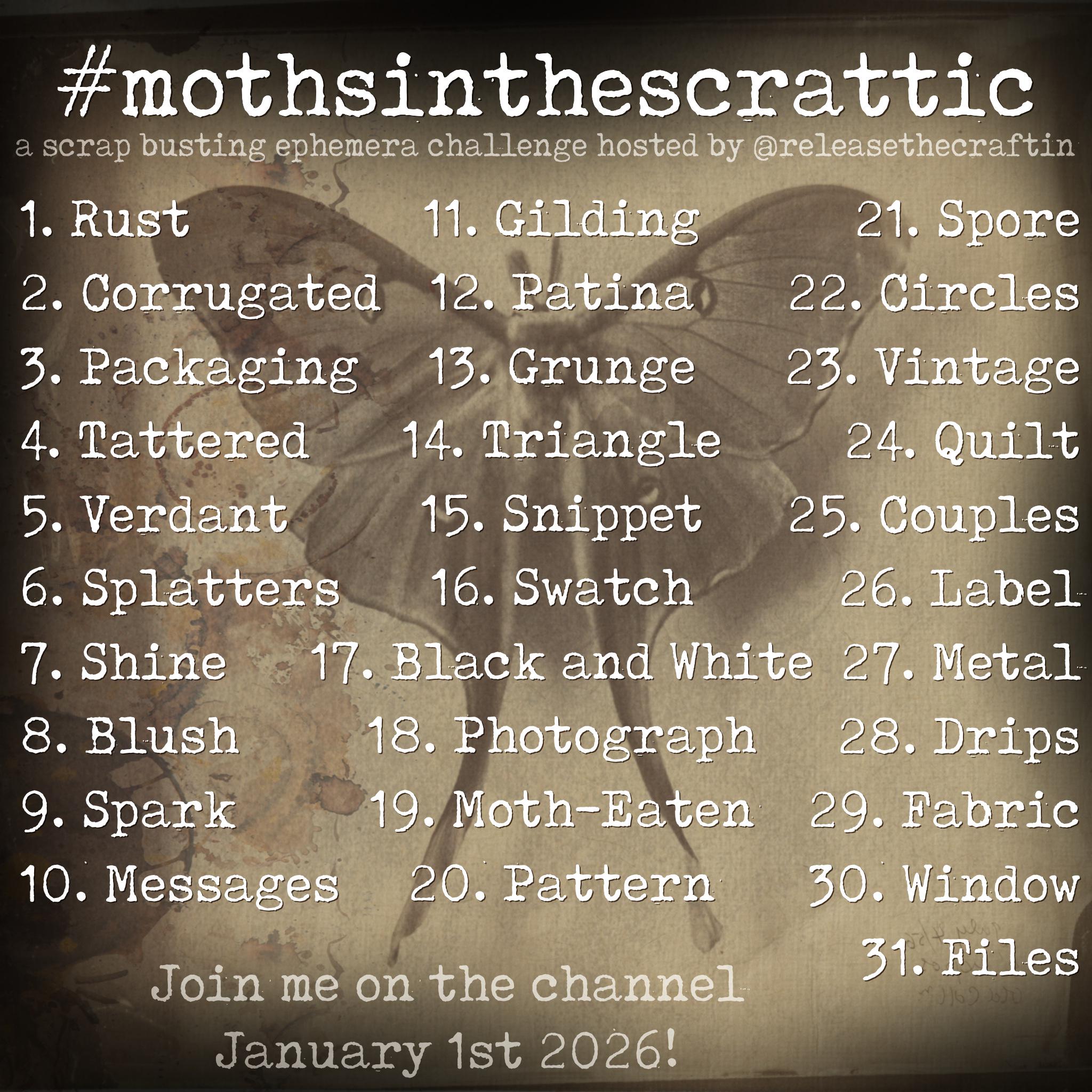 Hey guys! Here it is the prompt list for my scrap busting ephemera making challenge! Join me for 31 days of fun! Use the hashtag #mothsinthescrattic to follow along and to share what you make!