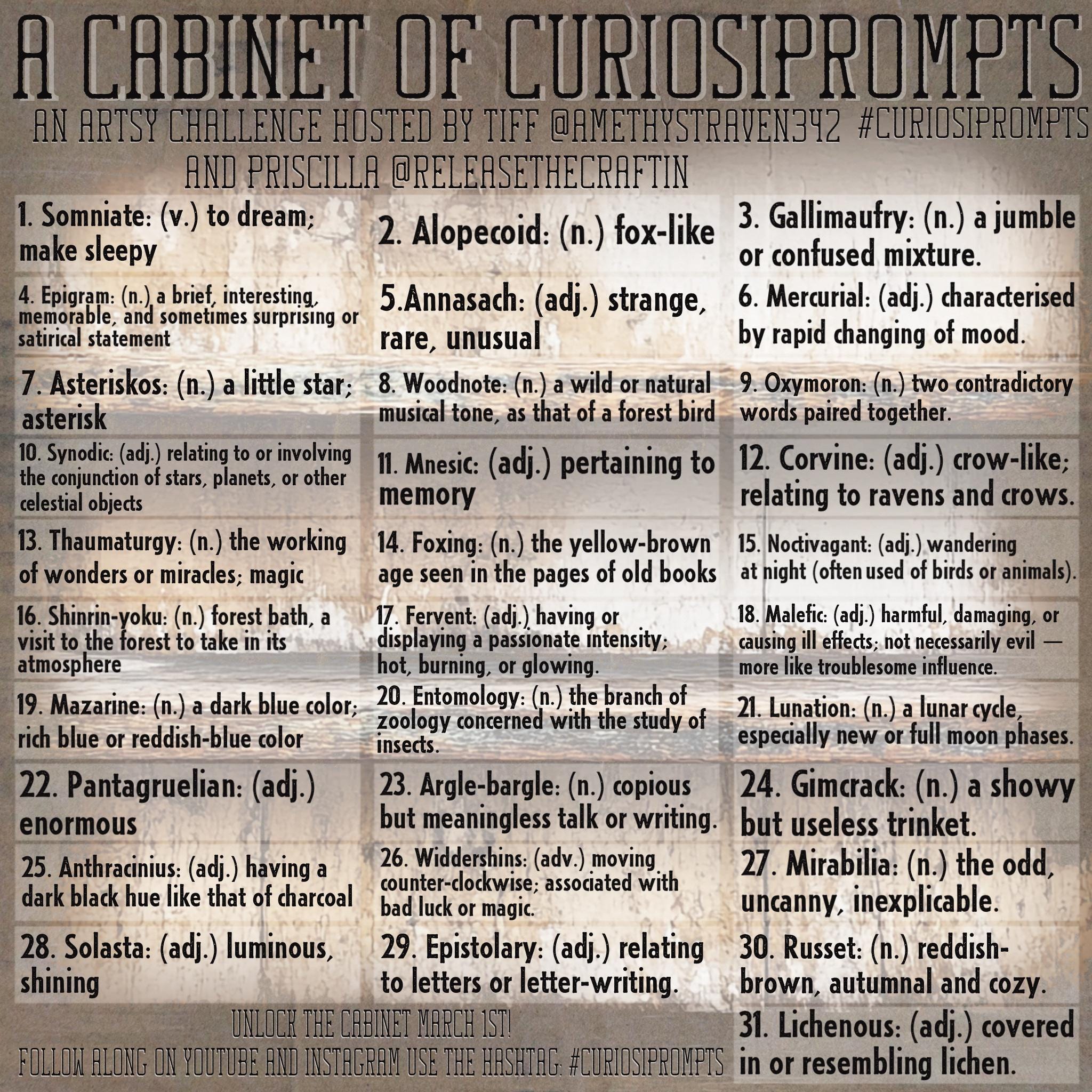 Join me as we unlock the Cabinet of Curiosiprompts! Myself and Tiff @Amethystraven342 are going to collaborate for a month long exploration of curious words and art!